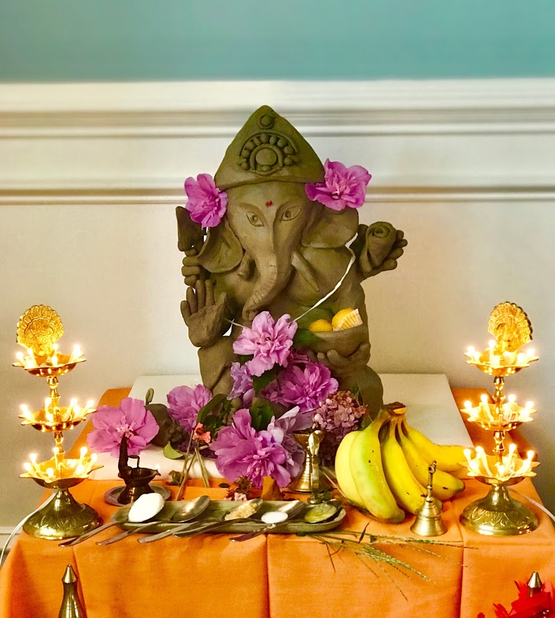 Make a small Ganesha with turmeric and water, and place on a leaf. Establish life with the following invocation from the vedas.