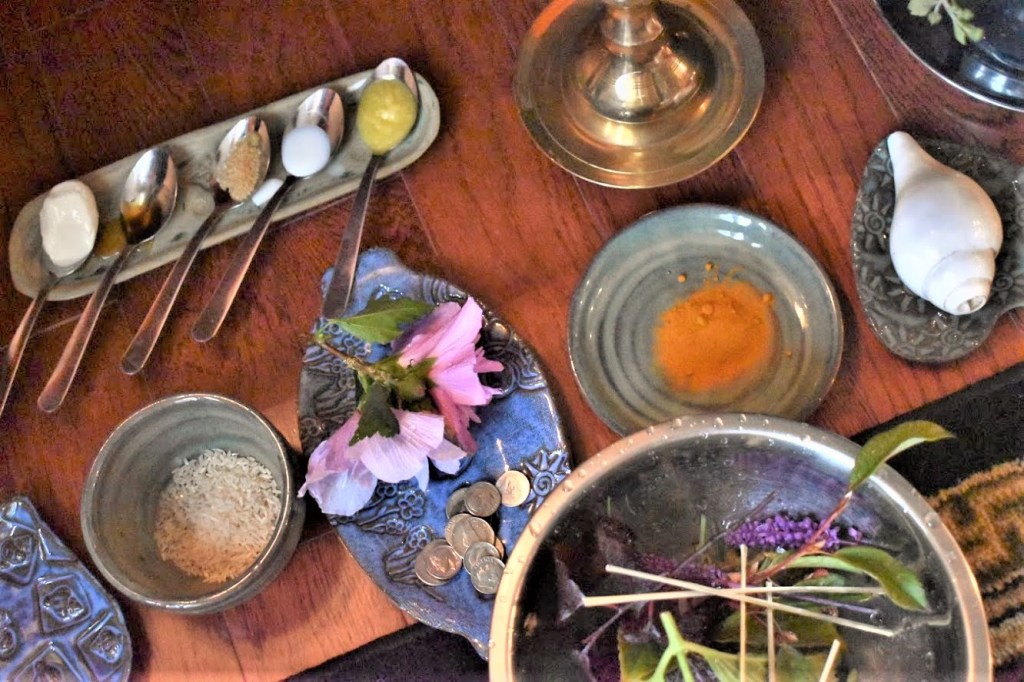 - Collect various ingredients and arrange in the puja area – water, turmeric, rice, incense sticks, piece of thread, sweets and fruits, and few coins.